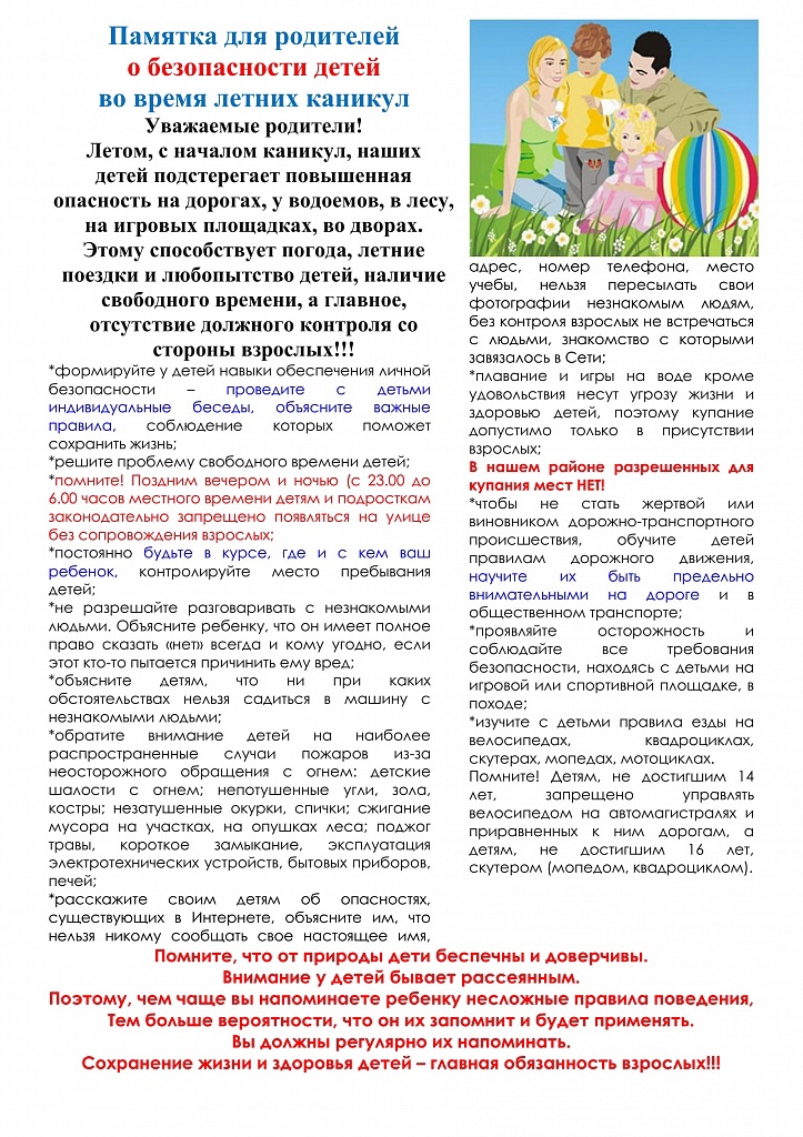 С началом каникул, наших детей подстерегает повышенная опасность на дорогах, у водоѐмов, в лесу, на игровых площадках, в садах, во дворах. Этому способствует погода, поездки и любопытство детей, наличие свободного времени, а главное отсутствие должного контроля со стороны взрослых. Чтобы дети были отдохнувшими, здоровыми и живыми надо помнить ряд правил и условий при организации их отдыха с родителями, родственниками, друзьями (на даче, в деревне у бабушки и т. д.):