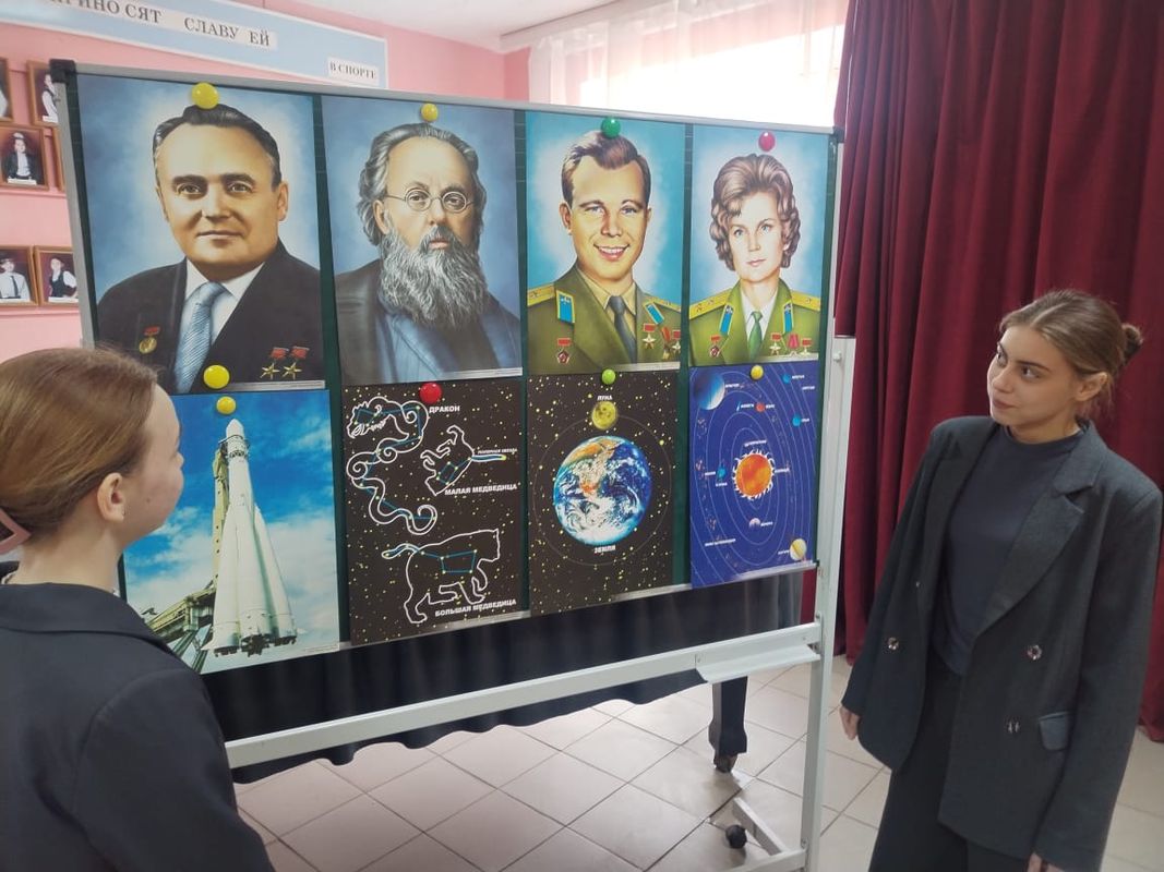 Также под руководством наставников ученики начальных классов "Орлята России" оформили стенд, на котором разместили портреты космонавтов.
