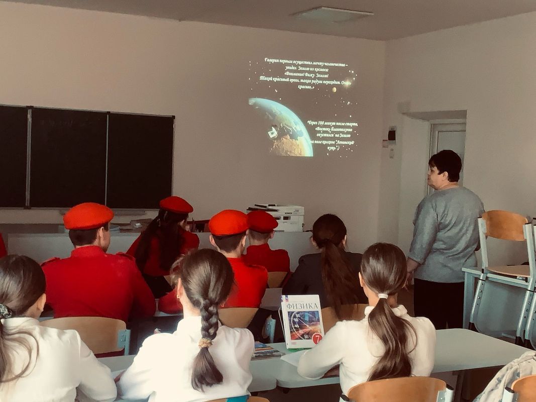 В центре "Точка Роста" под руководством учителя физики Лесничей И. А. была представлена краткая историческая справка о первом полёте человека в космос. Рассказ учителя дополнялся интерактивной презентацией о космосе.