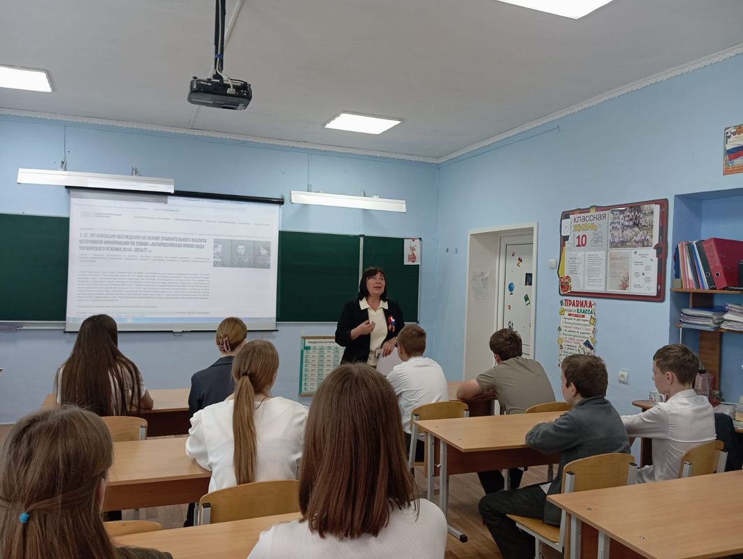 В МБОУ «Большекрепинская СОШ» имени Героя Советского Союза Пода П.А. с целью сохранения исторической правды о преступлениях нацистов и их пособников в отношении мирных советских граждан в годы Великой Отечественной войны на оккупированной территории для обучающихся 8 и 10 классов классные руководители Статывка Е.Н. И Статывка М.В., совместно с председателем Родионово-Несветайского отделения «Союз женщин России» Оноприенко Т.В. провели тематический классный час «Никто не забыт, ничто не забыто».