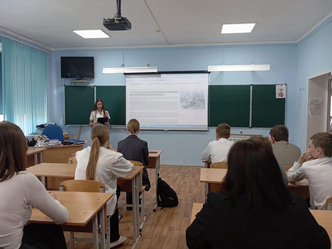 Учителя вели с ребятами разговор о необходимости сохранения памяти об ужасах войны, о понятии «геноцид» и ответственности за преступление по статье «геноцид» в национальном и международном праве.