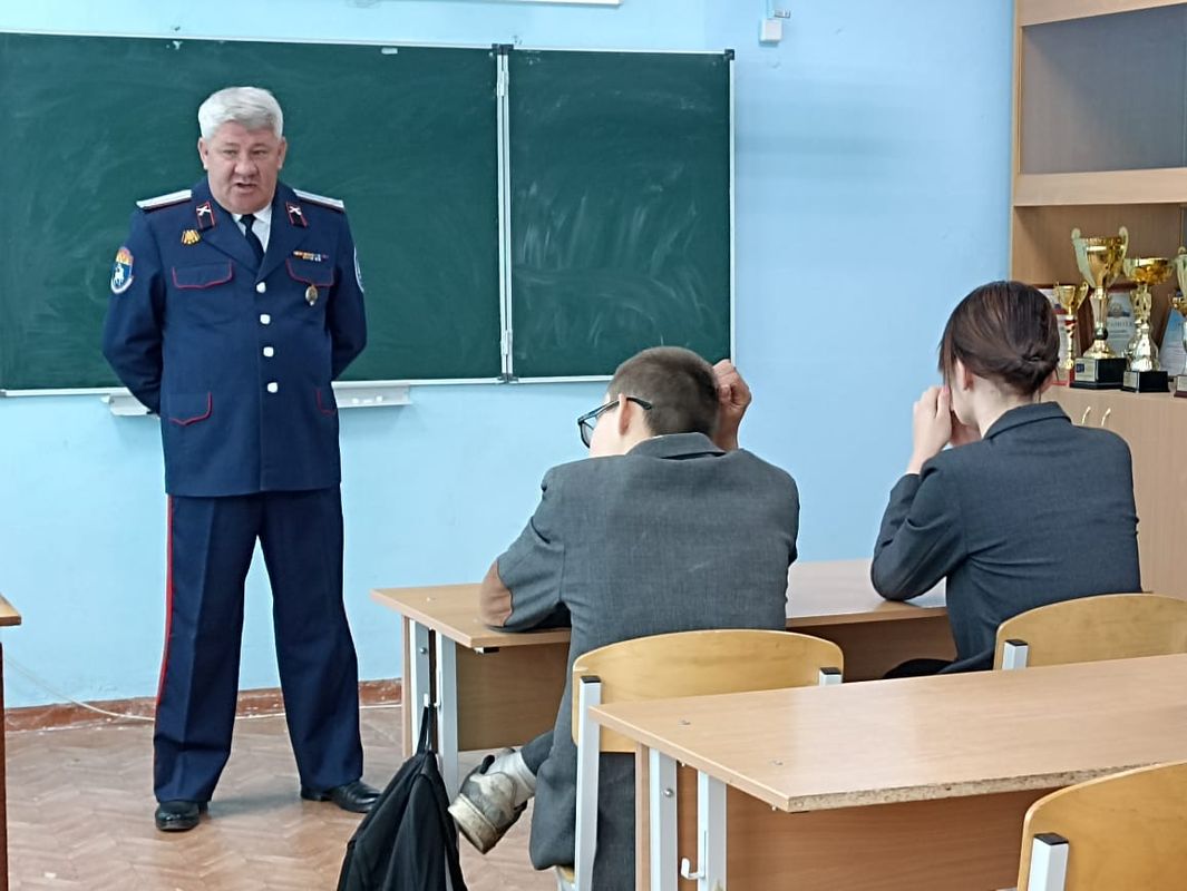 Он рассказал школьникам о том, как готовился к Параду Победы в качестве старшего инструктора парадного расчёта войскового казачьего общества «Всевеликое войско Донское». Ребята узнали, как важны казака спортивная подготовка, выносливость и сила духа. Велика роль также взаимовыручки и дисциплины.