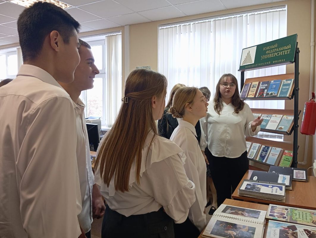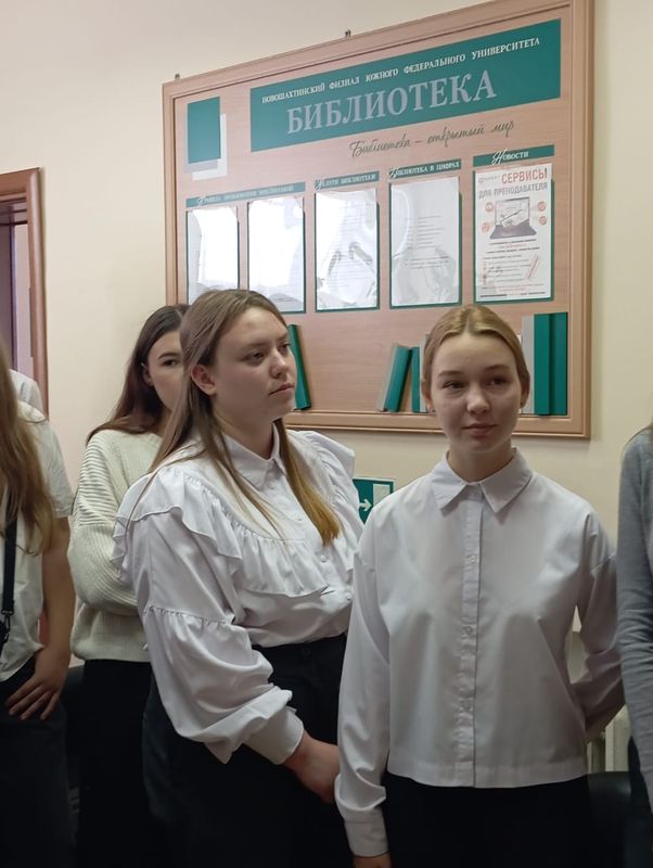 Маршрут экскурсии начался с посещения главного читального зала университета и библиотеки. Она обладает внушительным фондом книг, учебников и журналов, которые можно как изучить в печатном, так и в электронном виде. Так же в ней выставляются стенды с изданиями на определённую тему: педагогика и социальная работа, экономика, информатика, история Новошахтинска и Донского региона. Ученикам показали, как в каталоге электронных библиотек таких как ЮРАЙТ, Лань, на которые подписаны все студенты ЮФУ, можно найти интересующую научную литературу для написания исследовательских работ.