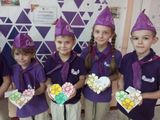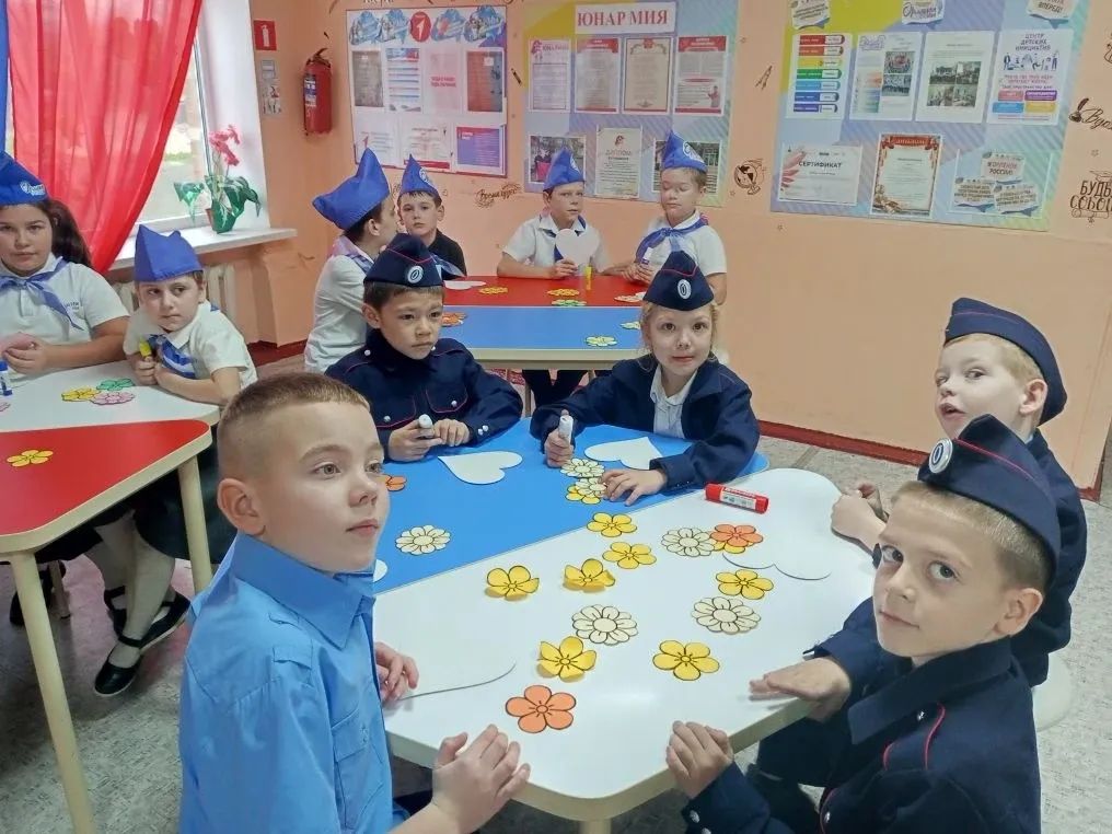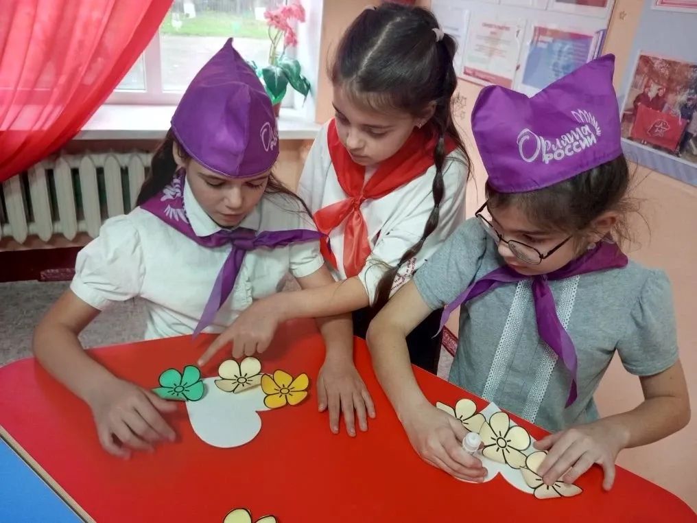 Орлята при поддержки директора школы Т. В. Оноприенко ,вместе с советником директора по воспитанию Людмилой Киселевой, председателем Первичного отделения Я. А. Изотовой и классных руководителей творили чудеса- делали открытки.