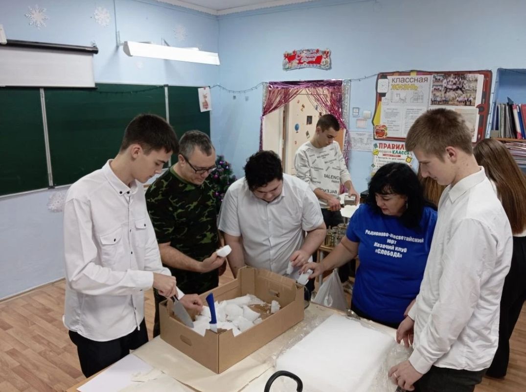 В канун Нового года собрались ребята, родители из поискового отряда «ДОН» и вместе с директором школы, председателем Родионово-Несветайского отделения «Союз женщин России» Т.В. Оноприенко, руководителем поискового отряда М.В. Статывка трудились над изготовлением окопных свечей.
