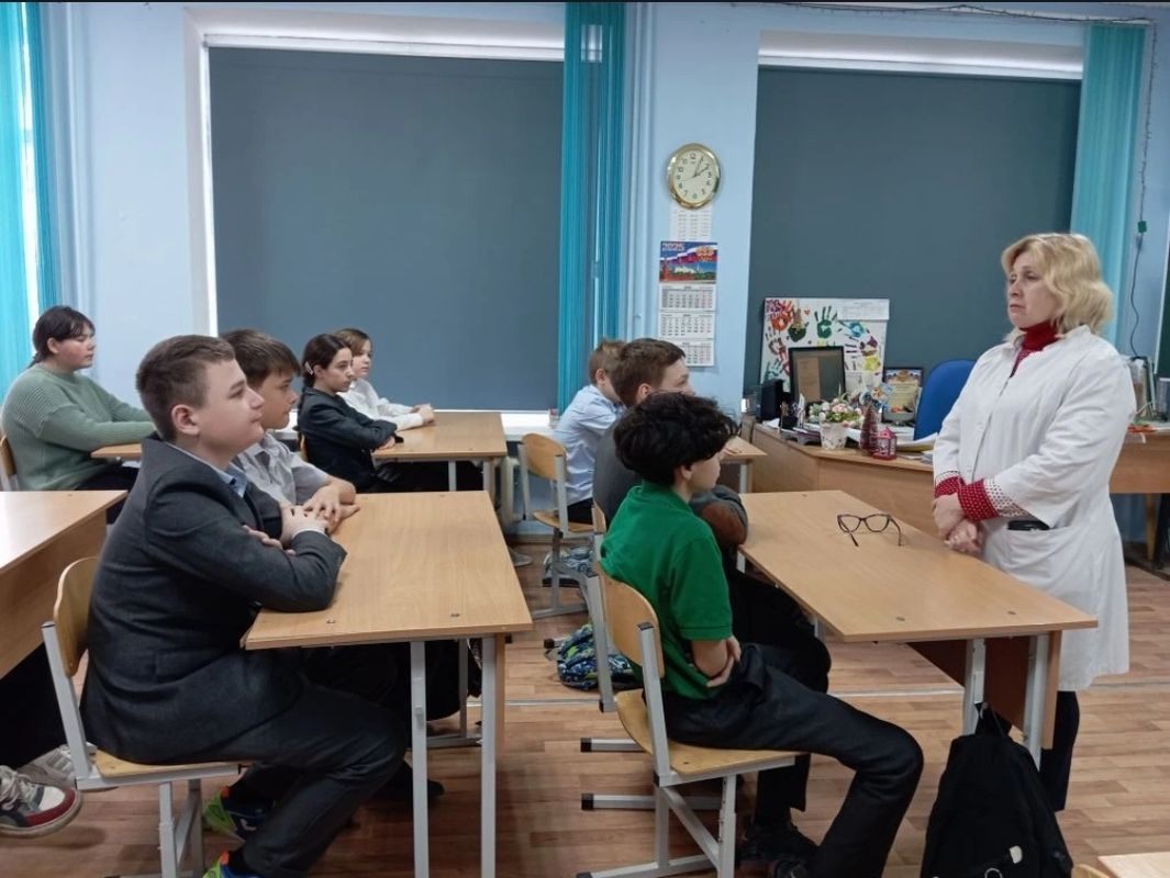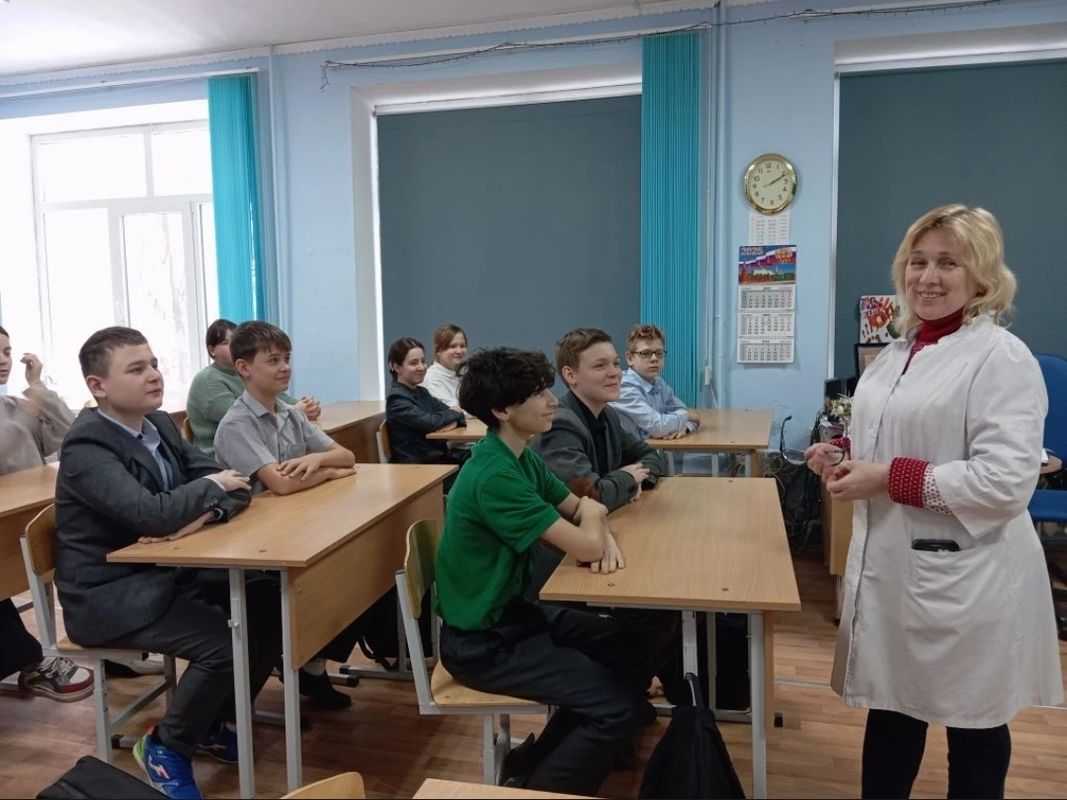 В рамках реализации проекта «Билет в будущее» по профессиональной ориентации заместитель директора по ВР Статывка М.В. для обучающихся 7 и 11 классов провела мероприятие «Люди в белых халатах». На мероприятии дети познакомились со спецификой медицинских специальностей, с историей их возникновения, с главными составляющими профессионального успеха фельдшера, медицинской сестры, фармацевта, а также с новыми медицинскими специальностями, связанными с инновационными технологиями. На встречу с обучающимися была приглашена медсестра Большекрепинской врачебной амбулатории Светлана Анатольевна Клюшина.