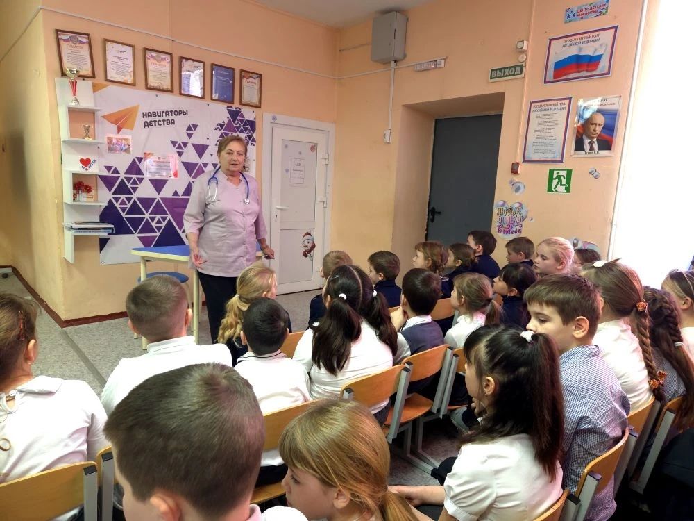 Елена Ивановна рассказала младшим школьникам о том, кто такие врачи, зачем они нужны, какие бывают медицинские специальности — от педиатра и хирурга до стоматолога, фельдшера, медсестры и лаборанта. Особое внимание было уделено важности заботы о здоровье, внимательности, ответственности и доброте в работе медика.