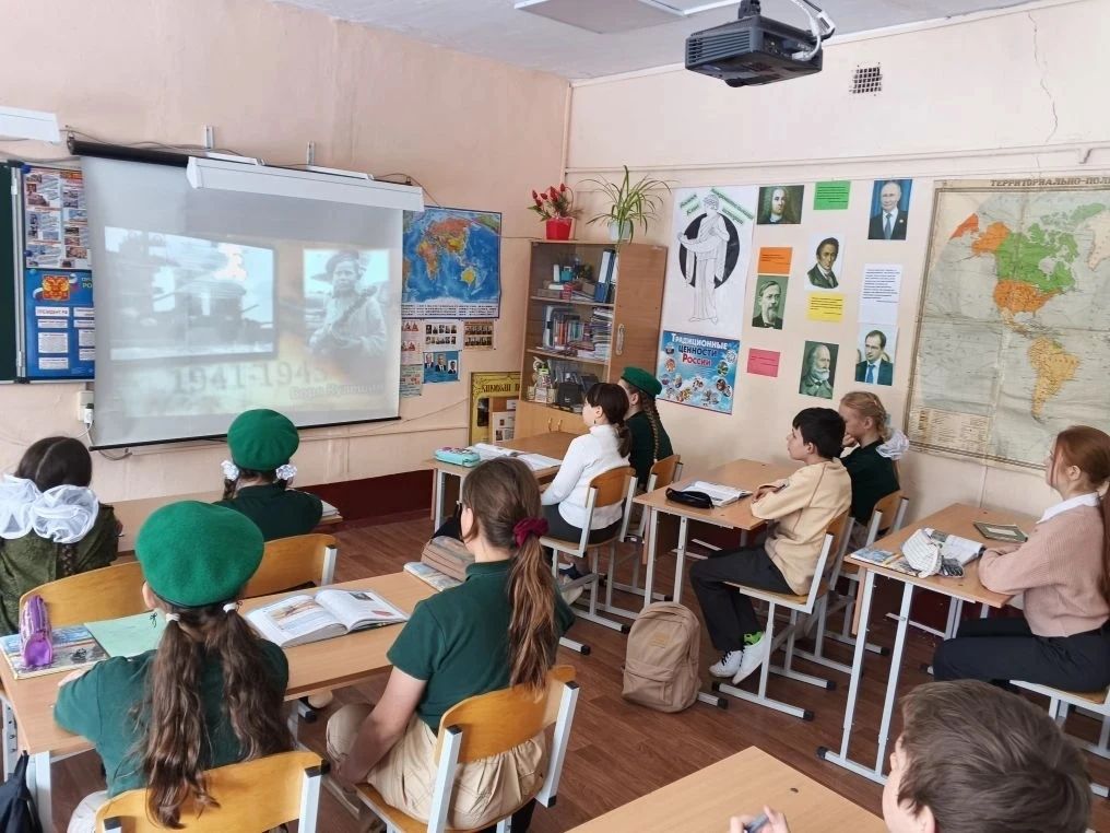 На уроке истории (учитель Яковенко Л. Н.) пятиклассники познакомились с подвигами Бори Кулешина, Аркадия Каманина, Володи Дубинина и других ребят, кто во время Великой Отечественной войны встали рядом со взрослыми защищать Родину.