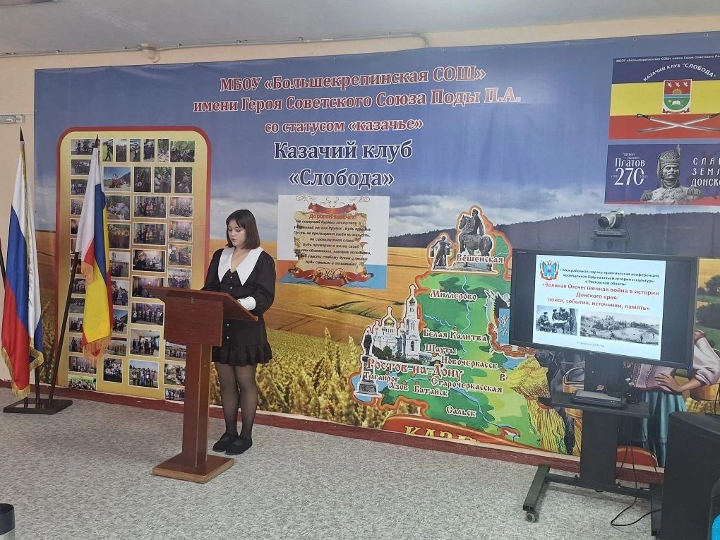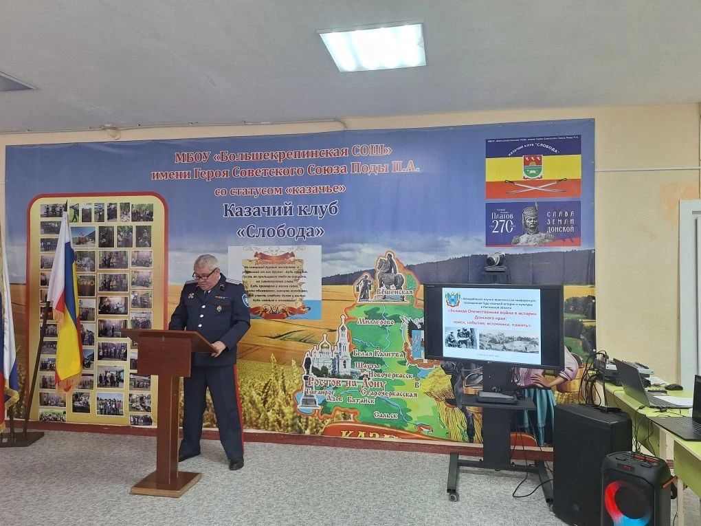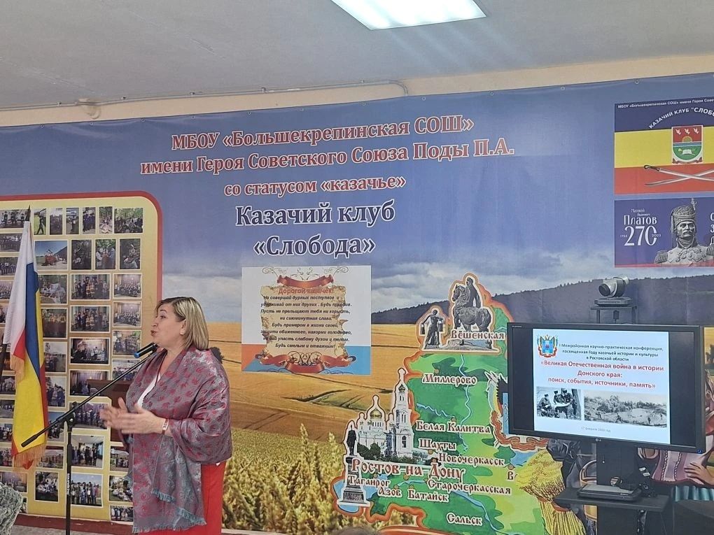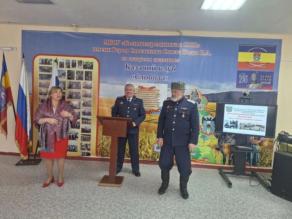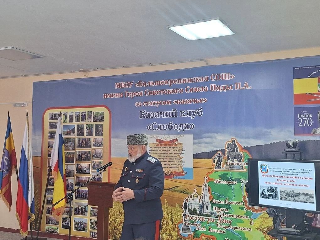 17 февраля 2026 года на базе МБОУ «Большекрепинская СОШ» имени Героя Советского Союза Пода П.А. состоялась I Межреспубликанская научно-практическая конференция «Великая Отечественная война в истории Донского края: поиск, события, источники, память», посвященная Году казачьей истории и культуры.