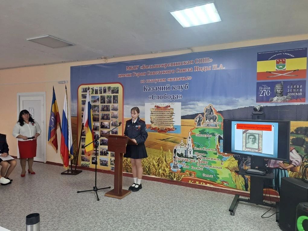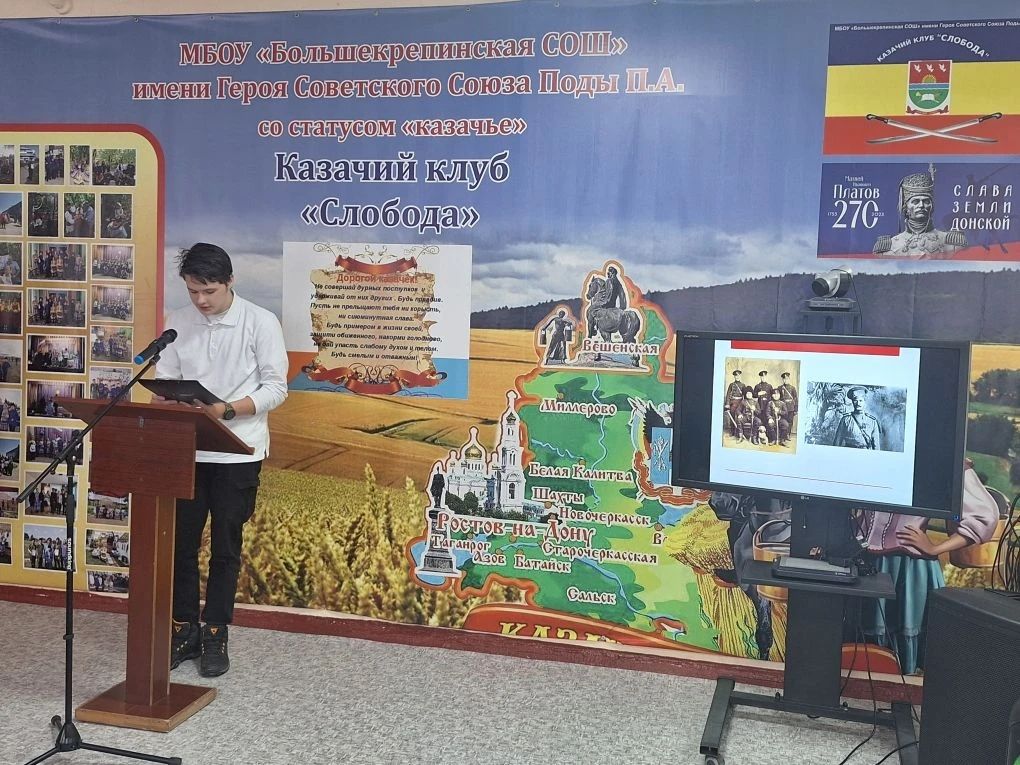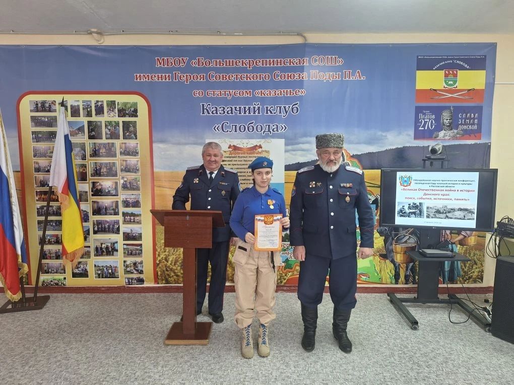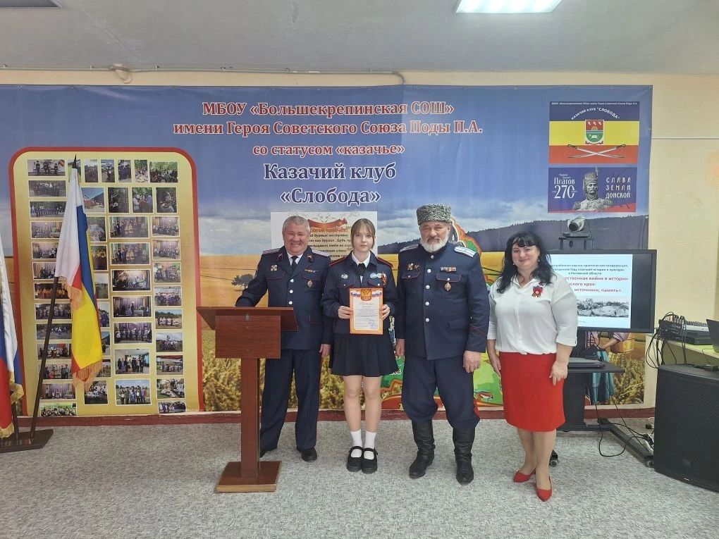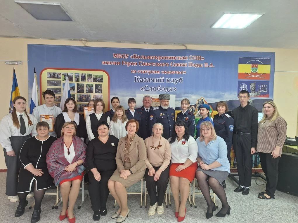 17 февраля 2026 года на базе МБОУ «Большекрепинская СОШ» имени Героя Советского Союза Пода П.А. состоялась I Межреспубликанская научно-практическая конференция «Великая Отечественная война в истории Донского края: поиск, события, источники, память», посвященная Году казачьей истории и культуры.