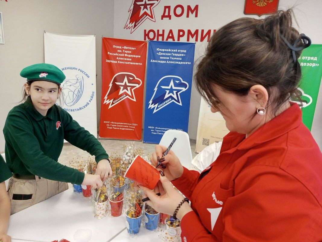 🇷🇺Подготовка проходила в дружеской и вдохновляющей обстановке в Доме Юнармии. Здесь звучали слова благодарности защитникам, обсуждались идеи оформления, писались добрые записки и пожелания. Каждый стаканчик стал символом внимания и искренней поддержки от школьников.