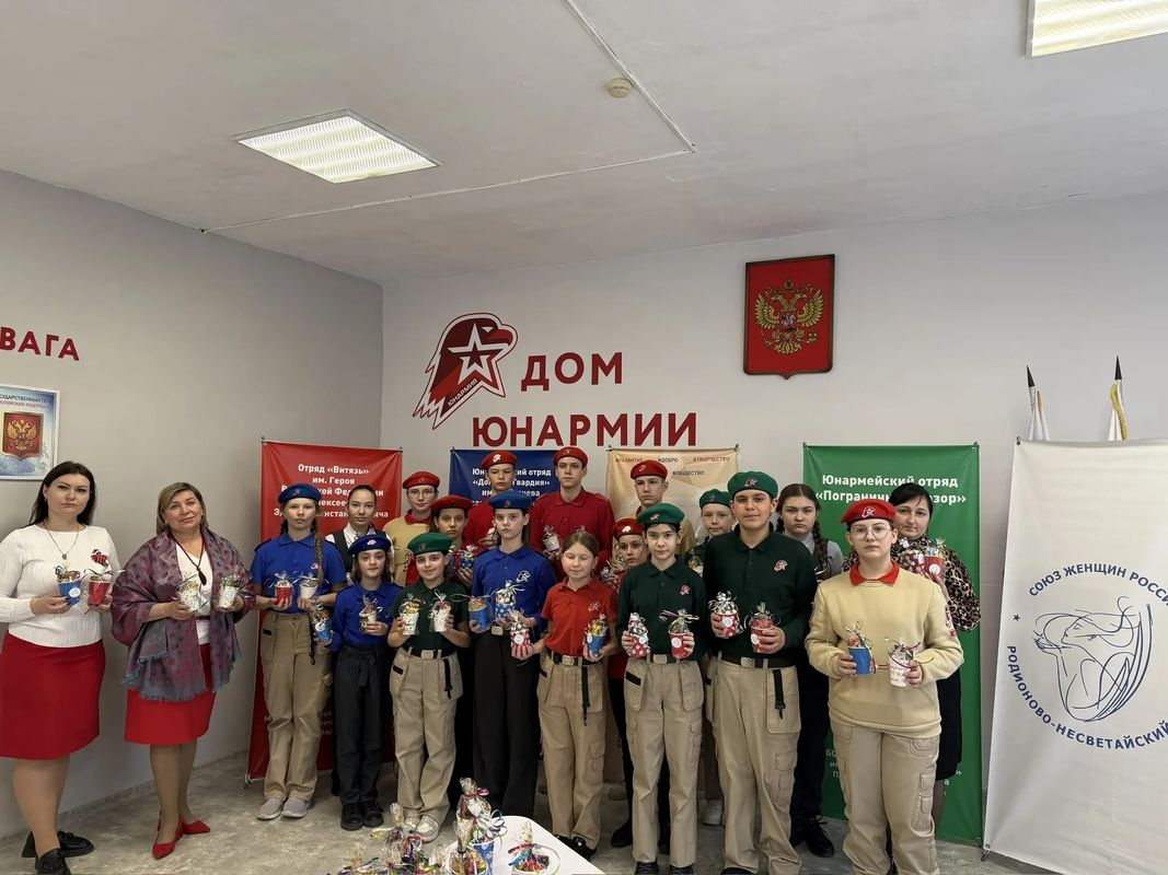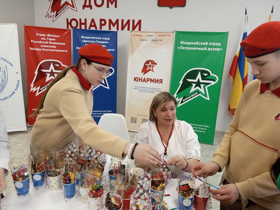 🇷🇺💥В преддверии Дня защитника Отечества в Доме юнармии Большекрепинской школы царила особая атмосфера тепла, заботы и единства.💥🇷🇺 Юнармейцы, активисты Движения первых вместе с председателем Родионово- Несветайского отделения «Союз женщин России» Т. В. Оноприенко, со своими наставниками организовали трогательную акцию поддержки для бойцов, находящихся в зоне СВО.