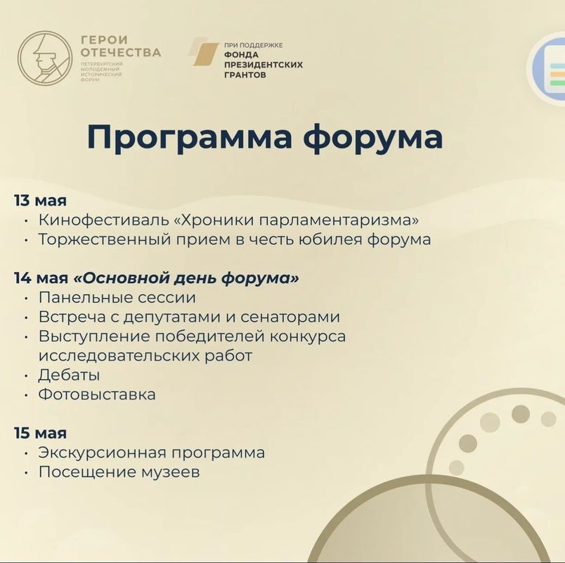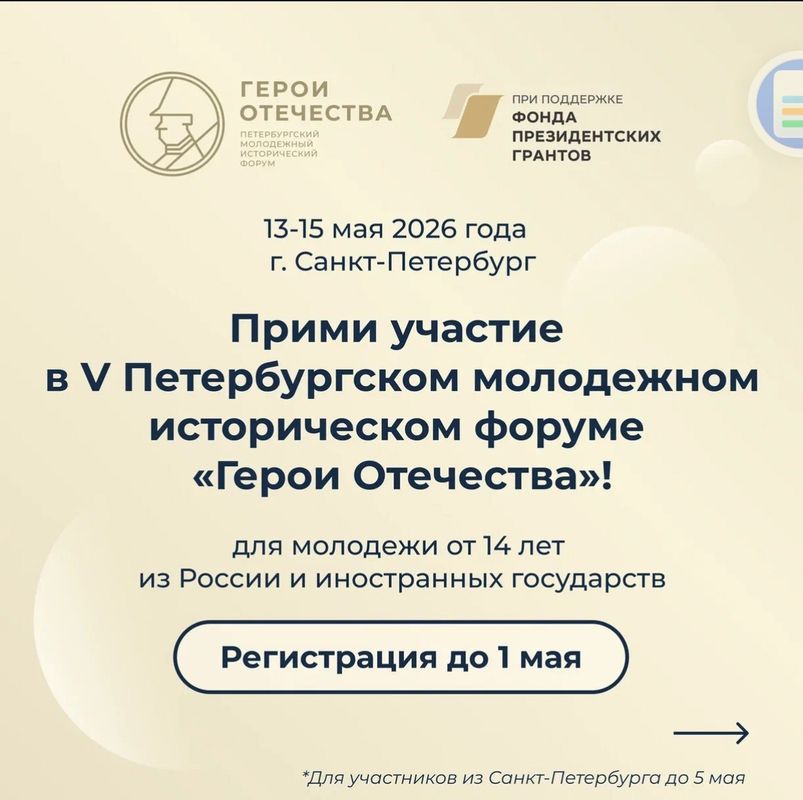 В период с 13 по 15 мая года в городе Санкт-Петербурге пройдет V Петербургский молодежный исторический форум «Герои Отечества» по инициативе команды школьников и студентов при поддержке Министерства просвещения Российской Федерации, Федерального агентства по делам молодёжи, Российского исторического общества, «Движение Первых», депутатов Государственной Думы и сенаторов Российской Федерации.