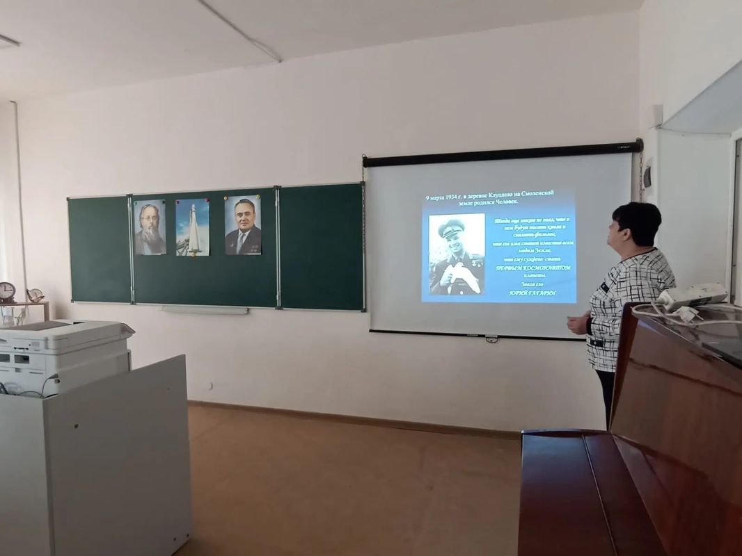 Учитель физики Лесничая И. А. подготовила презентацию, где рассказала о его семье, о детстве, о вступлении в отряд космонавтов.