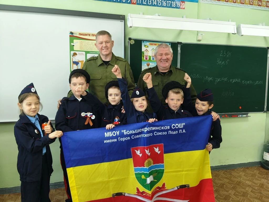 В день открытия парты героя и стендов памяти, нашу Большекрепинскую школу посетил Бабич Леонид Петрович заместитель войскового атамана ВКО Всевеликого войска Донского, руководитель КДМО "Донцы." Он пожелал юным казачатам- донцам учиться с усердием знания — ваше главное оружие.